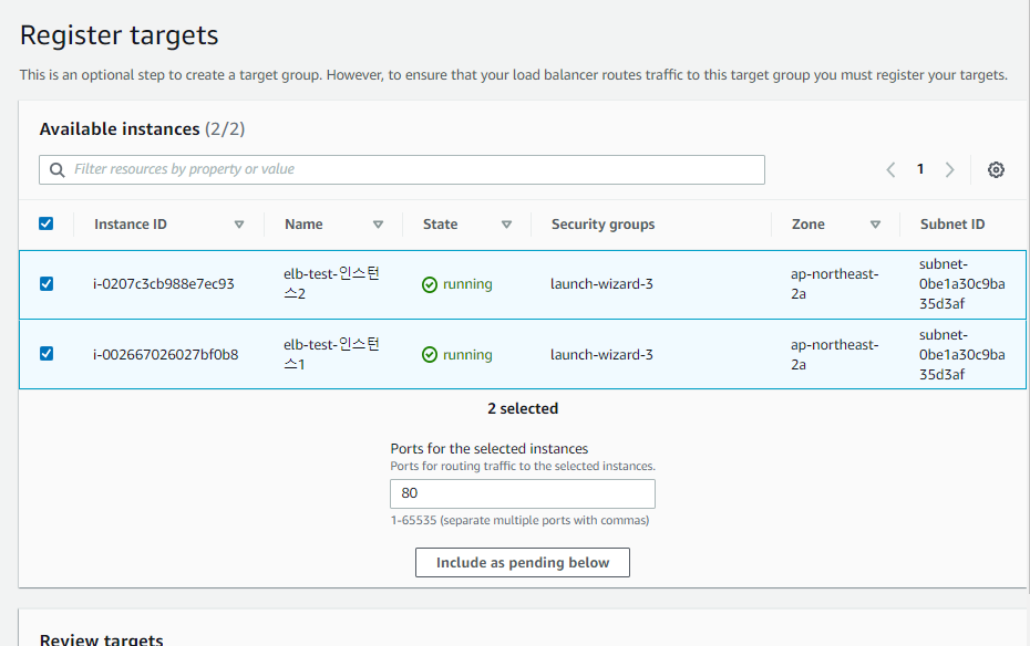 아직 target group setting 중이다. Next를 누르면 선택할 인스턴스 목록이 나온다. 미리 준비한 인스턴스 두 개를 선택한다. 80번 포트를 열어두었으므로 Ports for the selected instances는 80으로 그대로 둔다. Create target group을 한다.