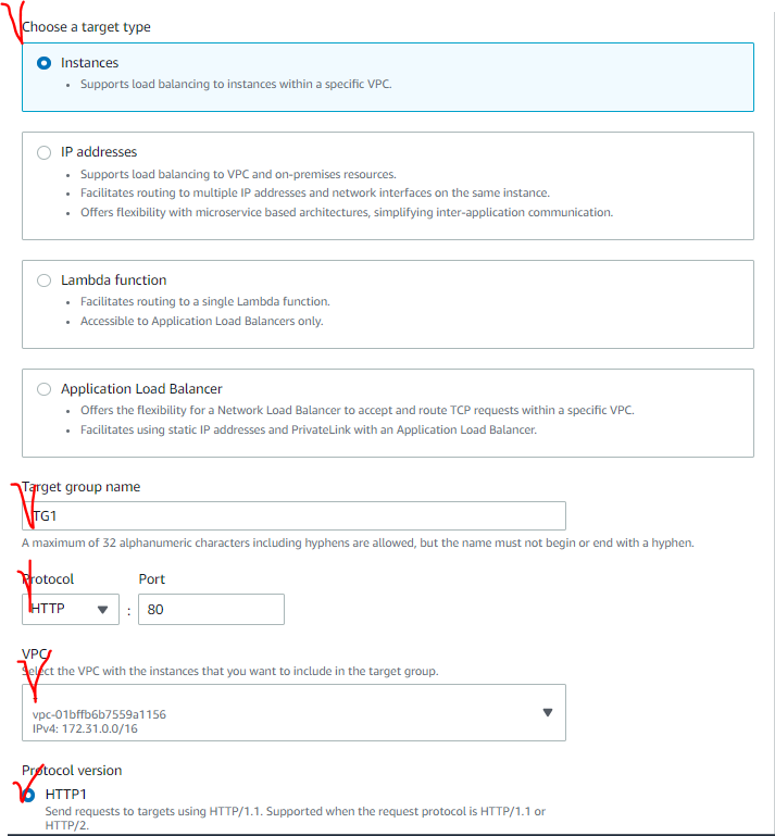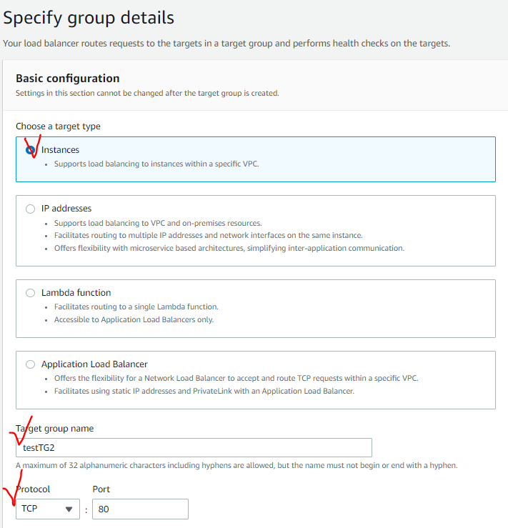 EC2 Instance를 대상으로 하기 때문에 target type을 Instance로 설정한다. 이름입력하고 TCP 80 포트를 대상으로 한다.