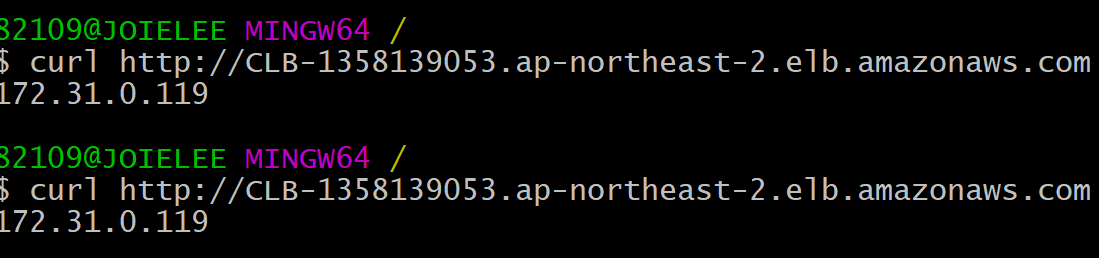 ELB 접속 주소를 이용해 curl로 접속을 해보면 다음과 같이 접속 부하를 두 인스턴스에 고르게 나누는 것을 확인할 수 있다. 이 때 하나의 컴퓨터를 컴퓨터를 다운시켜보면 하나의 EC2로만 접속되 것을 확인할 수 있다.