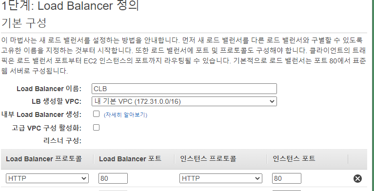 - 이름은 CLB로 정하고 LoadBalaner 프로토콜은 HTTP 80번포트만 열고 넘어간다(기본으로 설정되어있다)