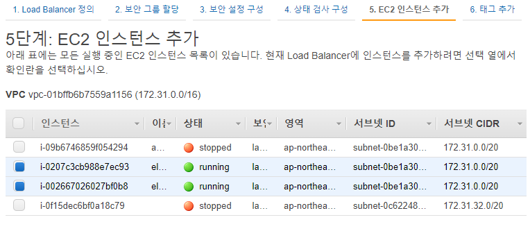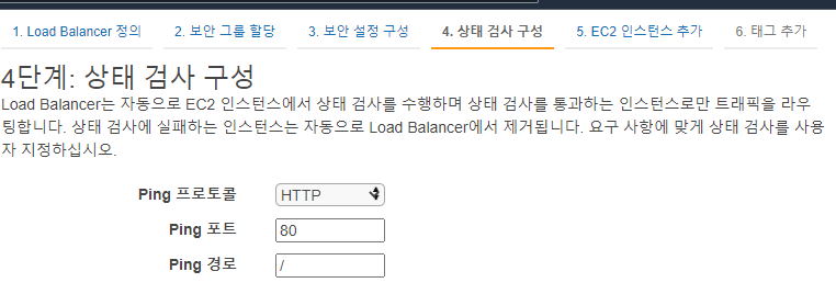 - 보안 그룹은 인스턴스를 만든 보안 그룹으로 설정한다. 보안 설정을 ssl 또는 https로 하라는 안내가 나오는데 ELB를 실습하는 것이므로 이 부분은 넘어간다
