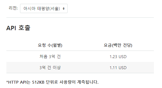 그런데 만약 항상 서버를 켜놔야 하지 않고, 이벤트를 발생시켜 작업을 하고 싶다면 인프라 관리가 따로 필요하지 않는 람다 서비스가 효율적이다. 서버가 없으므로 접근할 수 있는 URL를 열기 위해 API Gateway와 함께 사용하면 이벤트 함수를 발생시킬 수 있는 URL를 만들 수 있다. API Gateway는 월별 호출 요청수에 비례해 요금을 책정한다. 현재 서울 API 요금은 다음과 같다.