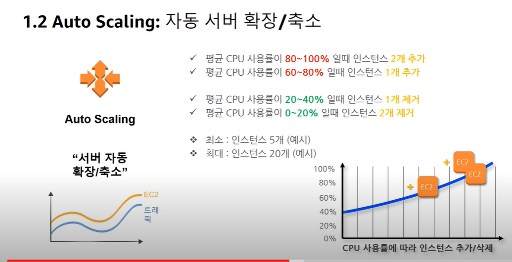 AWS의 탄력성을 가장 잘 보여주는 서비스가 Auto scaling으로 낭비되는 자원 없이, 과부하가 걸리지 않도록 그에 맞게 서버 용량을 확장시킬 수 있다.