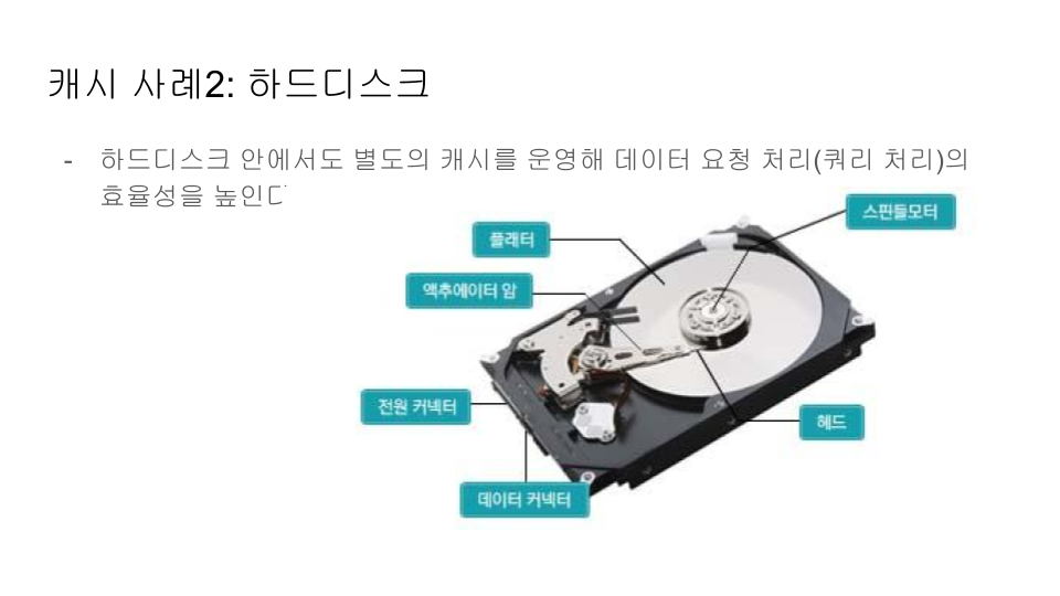 두번째로 하드디스크 자체에서도 이러한 캐시의 기능을 사용할 수 있습니다. 데이터를 불러올 때에도 자주 쓰이는 데이터는 캐싱을 해두고 빠르게 응답을 하는 것이죠.